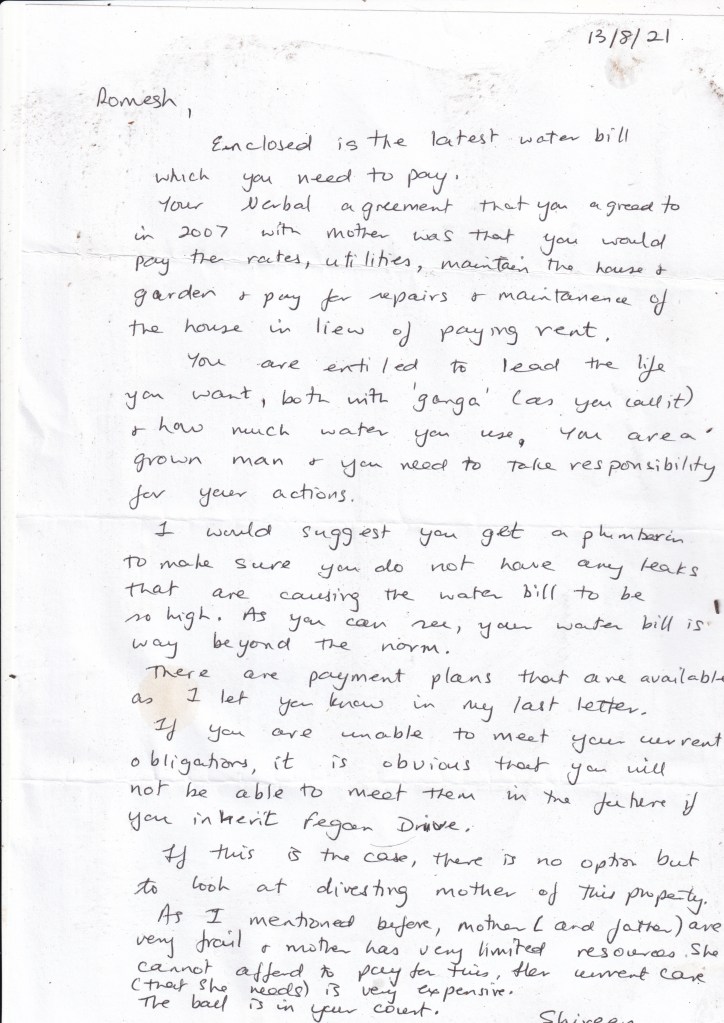 I also established Black Diamond Industries (BDI), Purple Dolphin Technologies (PDT), Dr Romesh’s Bird Sanctuary (DRBS), Cosmopolitan Green Ecology (CGE) and other Golden Ant Enterprises (GAE) over the next few years. That is why I use a lot of water. By the way, I did not have an agreement with my mother as my sister claimed. My mother agreed to pay me $500/month for promoting her art on line. She also wrote to the Brisbane City Council (BCC) that she intended to transfer the deeds to me back in 2016, but my sister talked her out of it. My mother also promised me $100,000 of the money she got for the sale of 3 acres of valuable land at 292 Pine Mountain Road, Carina Heights, but my greedy sister got our to open a joint account with her and stole it all.